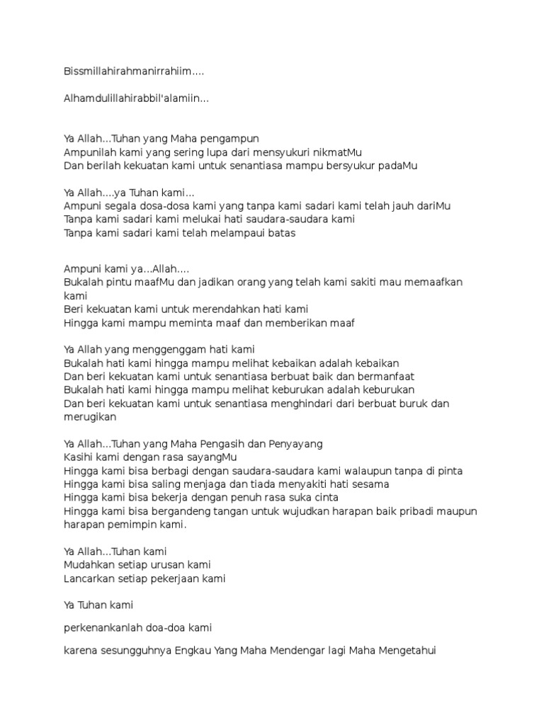 بِسْمِ اللهِ الرَّحْمنِ الرَّحِيمِ ، الْحَمْدُ للّهِ رَبِّ الْعَالَمِينَ ، حَمْدًا شَاكِرِيْن حَمْدًا النَّاعِمِيْن حَمْدًا يُوَافِيْ نِعَمَهُ وَيُكَافِىءُ مَزِيْدَهُ، يَارَبَّنَالَكَ الْحَمْدُ كَمَا يَنْبَغِيْ لِجَلاَلِ وَجْهِكَ الْكَرِيْمِ. اللهم صل وسلم على سيدنا محمدوعلى أله وصحبه أجمعين. Jul 22, 2015 · kebetulan hari ini diminta bapak bikin pidato doa untuk acara halal bihalal di kantor beliau. Bingung, puasa arafah ikut siapa? Sep 19, 2017 · doa halal bihalal kantor 2; Baik bagi pribadi kami sebagai seorang hamba. Sebagai suami, sebagai istri, sebagai pegawai, sebagai atasan sebagai bawahan ataupun sebagai pemimpin bagi diri kami sendiri. Doa halal bi halal idul fitri allahuma shalli wa sallim wa barik'ala muhammad, wa'ala alihi wa ashbaihi ajmain. More images for doa halal bihalal » Dengan segala kerendahan hati, kami yang siang hari ini berkumpul di tempat ini, perkenankanlah untuk mempersembahkan rasa puja dan. Kisah kejujuran anak penggembala kambing; Dengan demikian, halal bihalal menurut tinjauan hukum fiqih menjadikan sikap yang tadinya haram atau yang tadinya berdosa menjadi halal atau tidak berdosa lagi. Doa halal bi halal dan 5 tips silaturahmi secara virtual ada banyak tradisi masyarakat umat islam di indonesia yang masih dilakukan.