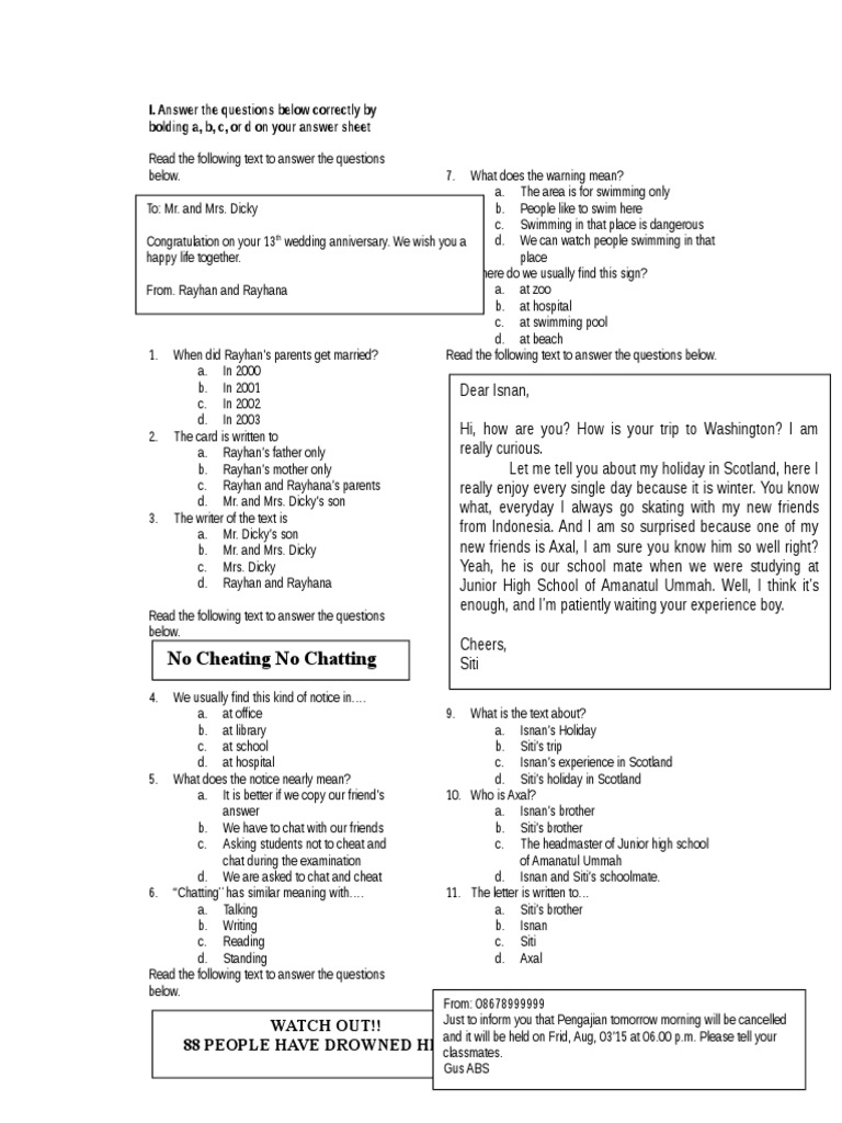 Soal uts bahasa inggris smp kelas 7 semester genap ta 2017/2018 yuk daripada basa basi terus kita langsung saja simak soal uts bahasa inggris smp kelas 8 semester genap ta 2017/2018 berikut ini. Bagi bapak dan ibu guru smp tidak terasa, sebentar lagi akan memasuki akhir semester genap. Soal bahasa inggris kelas 8 semester genap: Berikut soal pat bahasa inggris kelas viii update selengkapnya. Soal bahasa inggris semester genap viii 2016 1. Download contoh latihan soal uas semester 2 genap kelas 9. Demikianlah soal uas/pas bahasa inggris kelas 8/ viii jenjang smp/mts semester 1 kurikulum 2013 yang dapat saya bagikan, semoga bermanfaat. Contoh soal bahasa indonesia kelas 8 smp semester 2 bacalah penggalan paragraf di bawah ini untuk menjawab soal nomor 1 4. June 4th , 2016 grade/sem : Asking, giving, and rejecting fora thing/items. Semester genap sudah setengah jalan, mari kita cek dan evaluasi hasil belajar kita selama setengah semester ini dengan mengerjakan soal pts bahasa inggris kelas vii semester genap soal berikut terdiri dari 45 soal pilihan ganda dilengkapi kunci jawaban. Soal bahasa inggris kelas 8. Soal dan jawaban bahasa inggris kelas 8 smp berikut merupakan contoh soal untuk latihan menghadapi ulangan tengah semester (uts) atau penilaian tengah semester (pts).